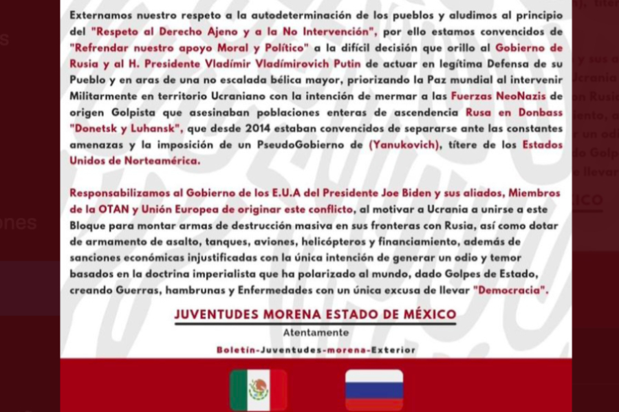 Luego de que la organización Juventudes Morena en el Estado de México se pronunciara a favor del conflicto desatado por Rusia para invadir Ucrania y la embajada rusa utilizara dicho respaldo para difundirlo en sus redes sociales, el partido Morena a nivel nacional se deslindó de dichas declaraciones.